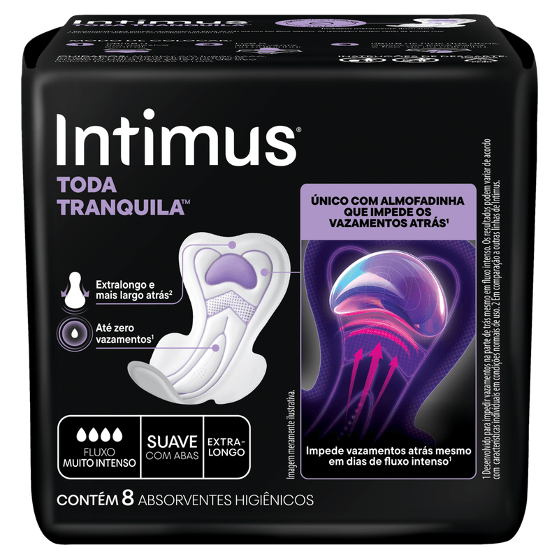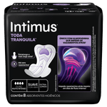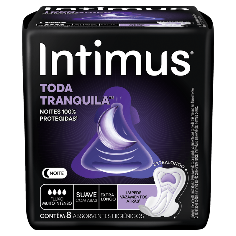 O Absorvente Noturno Toda Tranquila Extra Longo da linha Intimus é um absorvente higiênico com abas, indicado para uso noturno, oferecendo proteção e conforto durante o sono. Cada embalagem contém 8 unidades com cobertura suave, ideal para garantir segurança e tranquilidade.