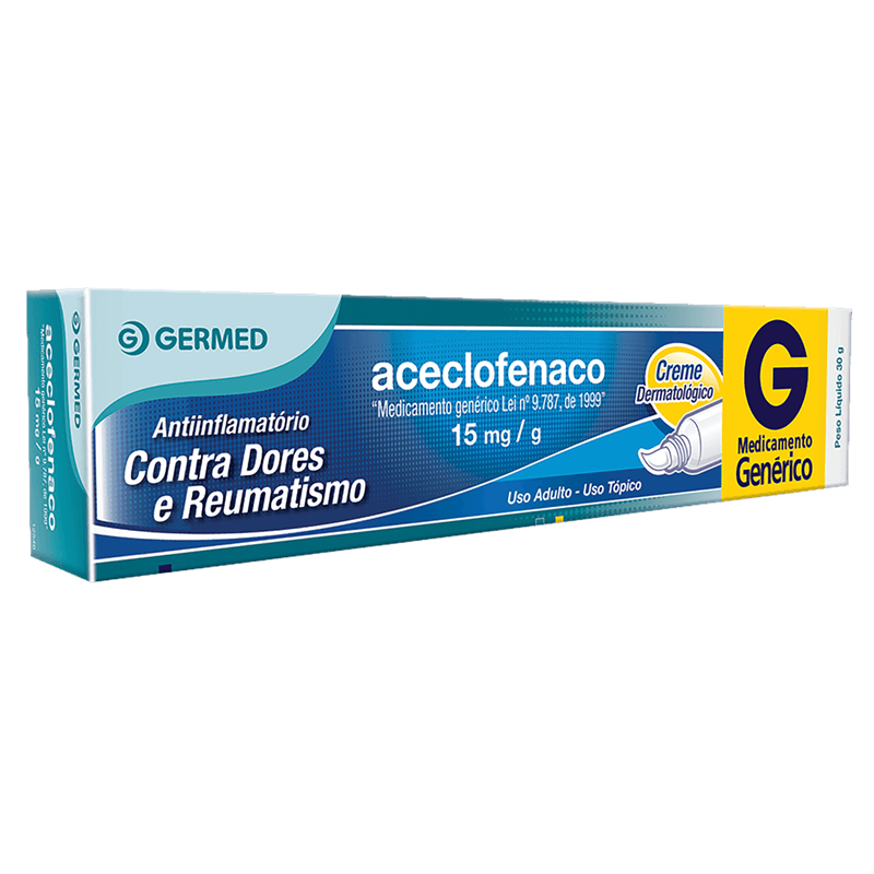 Aceclofenaco 15mg/g - Creme Dermatológico - Genérico Germed é um anti-inflamatório tópico eficaz para o alívio de dores e inflamações locais, como tendinite, tenossinovite, dor articular, luxação, periartrite, distensão muscular, dor lombar e torcicolo. Sua fórmula contém 15mg de aceclofenaco por grama, proporcionando ação analgésica, anti-inflamatória e antirreumática diretamente na área afetada. Ideal para adultos que buscam um tratamento localizado e rápido para desconfortos musculoesqueléticos.
