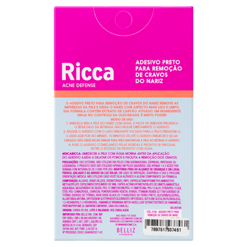 "O Adesivo Ricca Preto Para Remoção De Cravos foi desenvolvido especialmente para remover cravos do nariz, eliminando as impurezas da pele, deixando o nariz com aspecto mais liso e limpo.