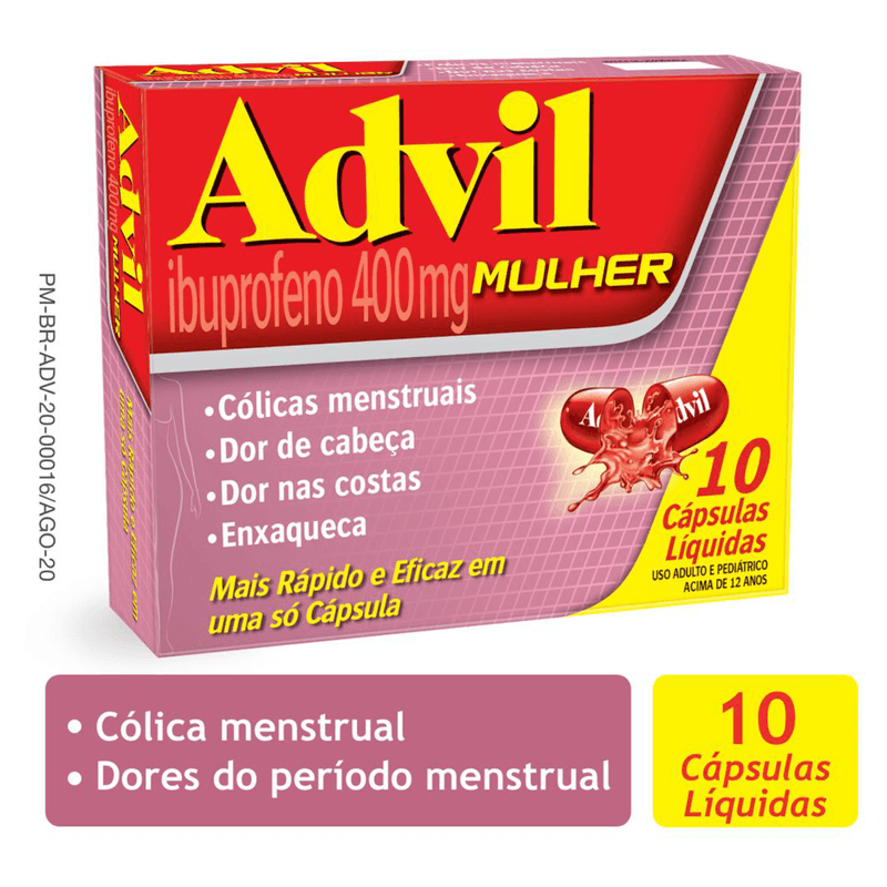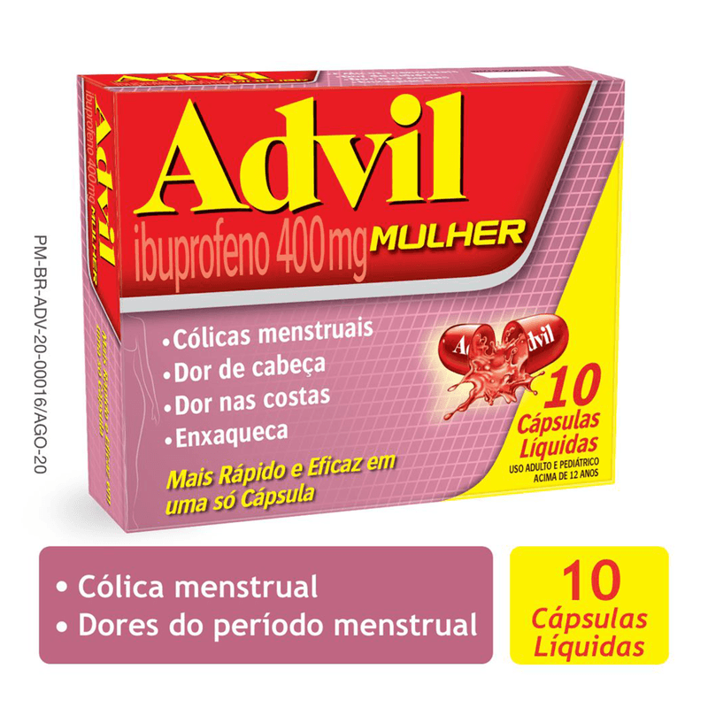 Advil Mulher 400mg é indicado para o alívio de dores leves a moderadas, como cólicas menstruais, dores nas pernas, dores musculares, dor de cabeça e enxaquecas.
