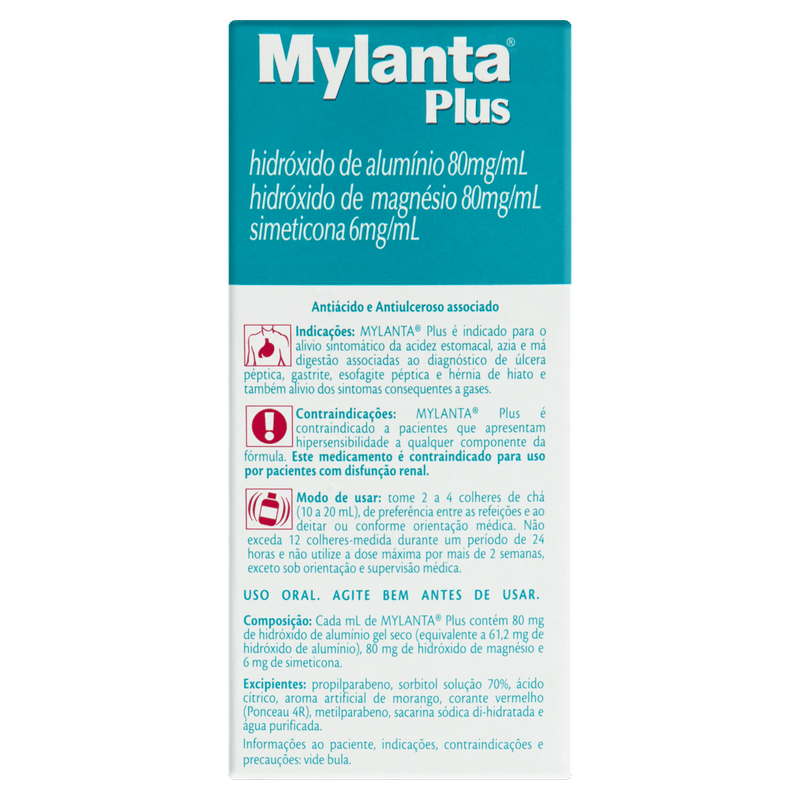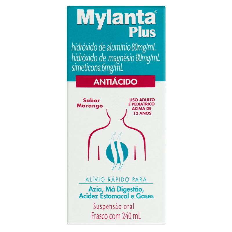 Mylanta Plus Morango possui sabor agradável que facilita a administração, especialmente para o público pediátrico acima de 12 anos. Sua fórmula em suspensão oral contém 80 mg/mL de hidróxido de alumínio gel seco, 80 mg/mL de hidróxido de magnésio e 6 mg/mL de simeticona, garantindo ação eficaz contra a acidez e gases. Produto de venda livre, indicado para o alívio sintomático de condições como úlcera péptica, gastrite, esofagite péptica e hérnia de hiato.