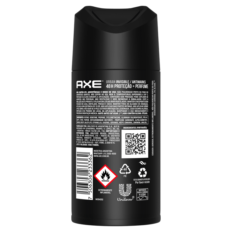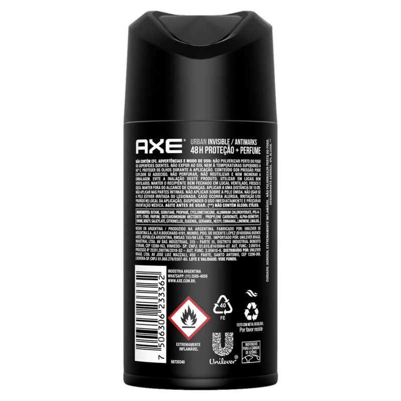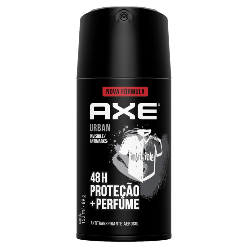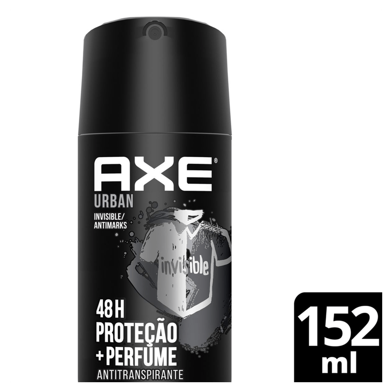 - A nova fórmula do Antitranspirante Aerosol Axe Urban Invisible te mantém protegido contra mau odor e manchas, além de te deixar fresco o dia inteiro