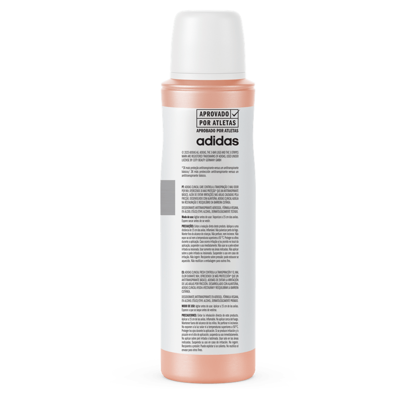 Adidas Clinical Care controla a transpiração e mau odor por 96h, oferecendo 3x mais proteção que um antitranspirante básico, além de evitar irritações nas axilas causadas pela fricção. Desenvolvido com Alantoína, Adidas Clinical auxilia na restauração e reequilíbrio da barreira cutânea.