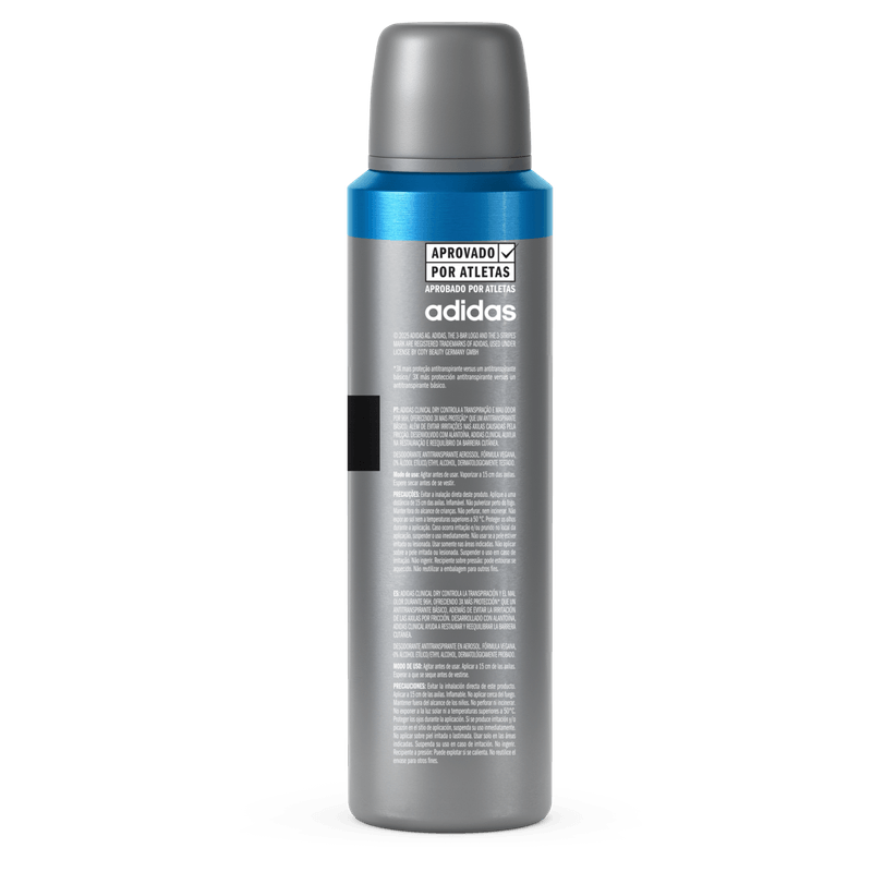 Adidas Clinical Dry controla a transpiração e mau odor por 96h, oferecendo 3x mais proteção que um antitranspirante básico. Além de evitar irritações nas axilas causadas pela fricção. Desenvolvido com alantoína, Adidas Clinical auxilia na restauração e reequilíbrio da barreira cutânea.