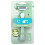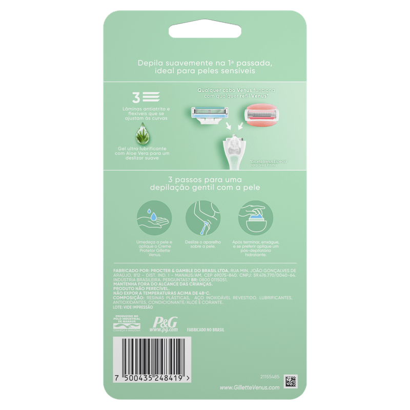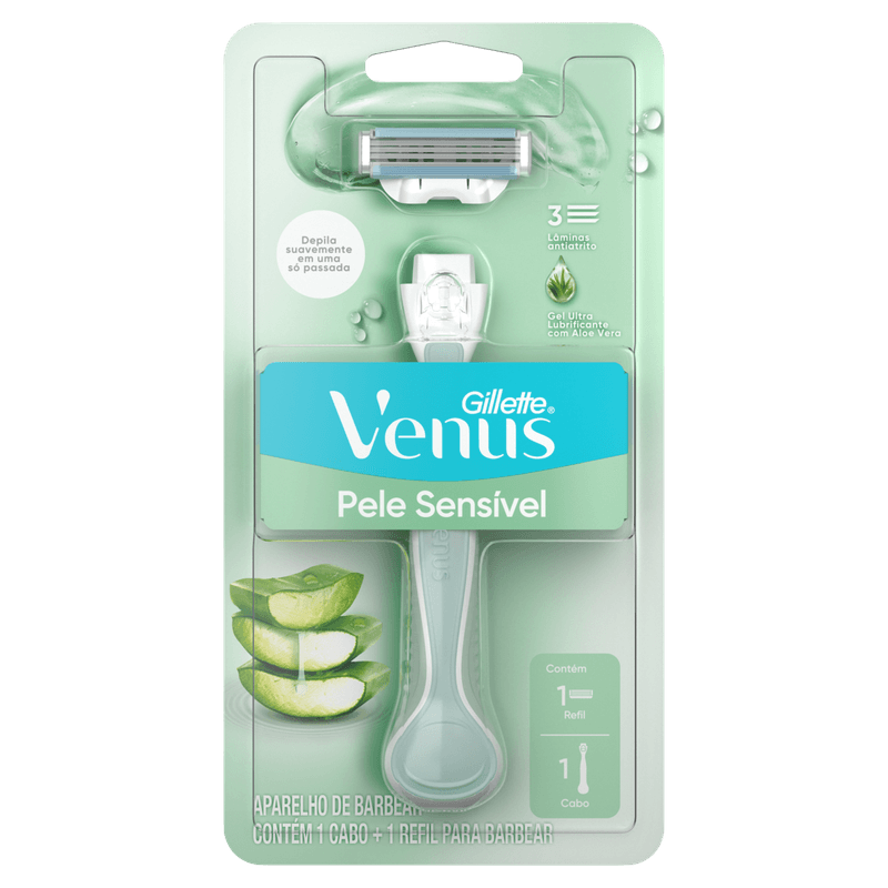 O aparelho de depilação Gillette Venus Pele Sensível depila suavemente em uma só passada. Ele possui uma fita lubrificante com gel ultra lubrificante com Aloe Vera para facilitar o deslizamento das lâminas, sendo ideal para peles sensíveis. A cabeça flexível e pequena do aparelho feminino Venus Pele Sensível se ajusta as curvas durante o depilação e suas 3 lâminas antiatrito proporcionam uma depilação gentil com a pele. Venus Pele Sensível é dermatologicamente testada para peles sensíveis. Para uma melhor experiência de depilação, experimente usá-lo com Creme Protetor Gillette Venus.