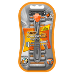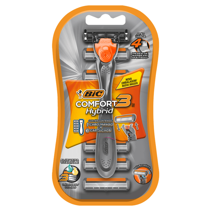 O Aparelho de Barbear Comfort 3 Hybrid da Bic possui 3 lâminas de aço inoxidável e fita lubrificante com Aloe Vera, Lanolina e Vitamina E, indicado para barbear mais rente e duradouro em todos os tipos de pele, inclusive as mais sensíveis.