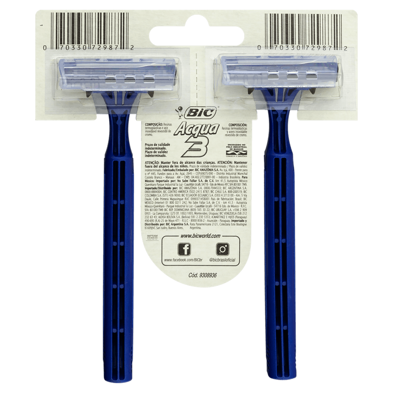 O Aparelho Descartável para Barbear Bic Acqua 3 vem com 2 unidades, indicado para barbear com conforto e segurança. Possui lâminas revestidas de cromo e cabo antideslizante, adequado para todos os tipos de pele.