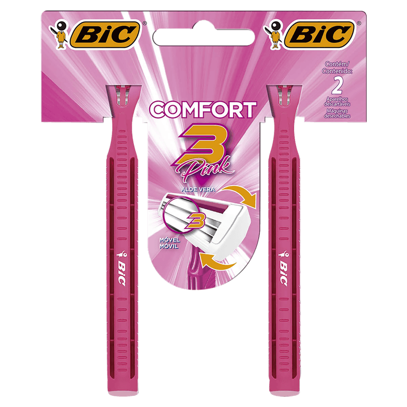 O Aparelho Descartável para Depilar Bic Comfort 3 Pink com 2 unidades é um aparelho descartável com 3 lâminas, desenvolvido para proporcionar uma depilação suave e eficiente. Conta com cabo antiaderente para melhor aderência e controle, além de cabeça móvel e fita lubrificante com Aloe Vera para maior conforto durante o uso.