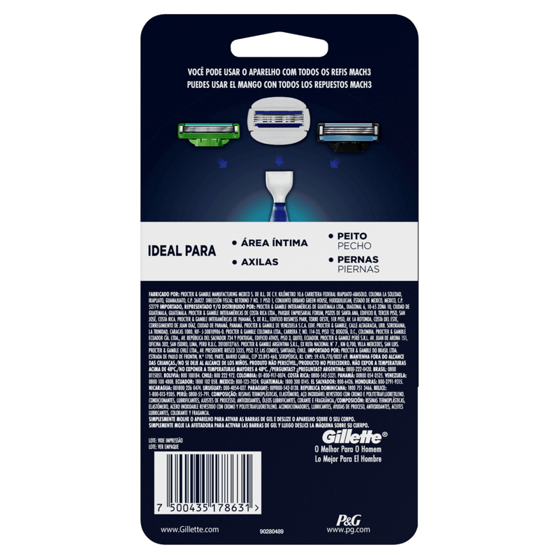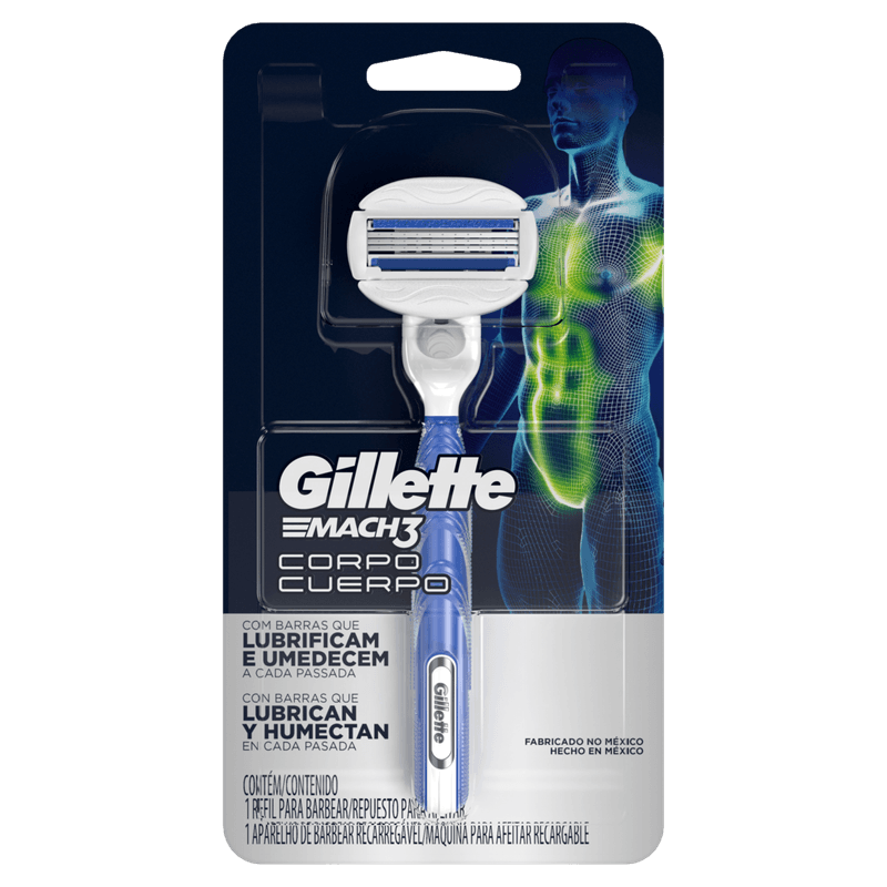 O Gillette Mach 3 é um aparelho de depilação projetado exclusivamente para o corpo masculino. Com cabeça arredondada, 3 fitas lubrificantes e 3 lâminas móveis Power Glide, proporciona deslize confortável. Seu design inclui cabeça arredondada para conforto, cabo antiderrapante para controle máximo, mesmo no banho. Ideal para áreas difíceis, oferece menos irritação, mesmo em regiões sensíveis do corpo.