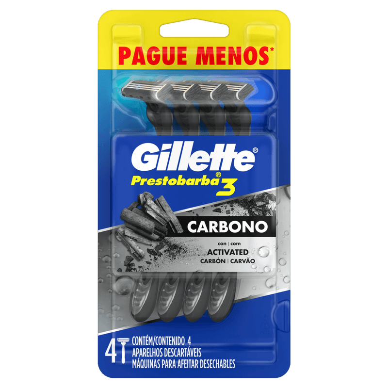 Aparelho Descartável para Barbear com Carvão Gillette Prestobarba3 Carbono 4 Unidades