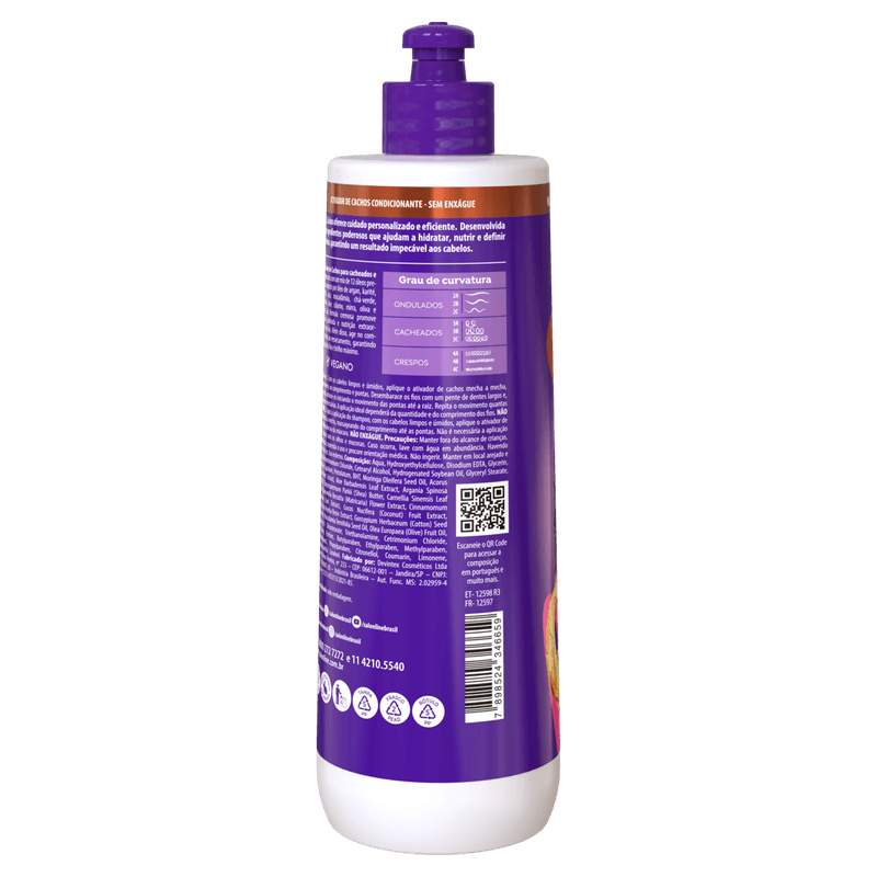 O ativador de cachos tem a função de ativar e definir os cachos de maneira mais especificas, deixando o cabelo muito mais definido. O Ativador S.O.S Cachos Nutritivo possui o poderoso Óleo de Moringa, rico em ácidos graxos e com alto poder nutritivo, além da Proteína do Trigo, que age reparando e nutrindo os fios danificados. Essa poderosa combinação devolve a hidratação perdida dos fios, deixando-os nutridos, brilhantes e controlados. Condicionador sem enxágue.
