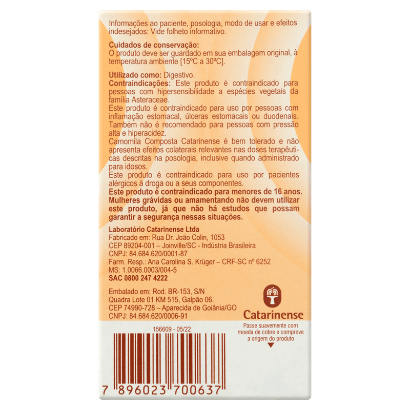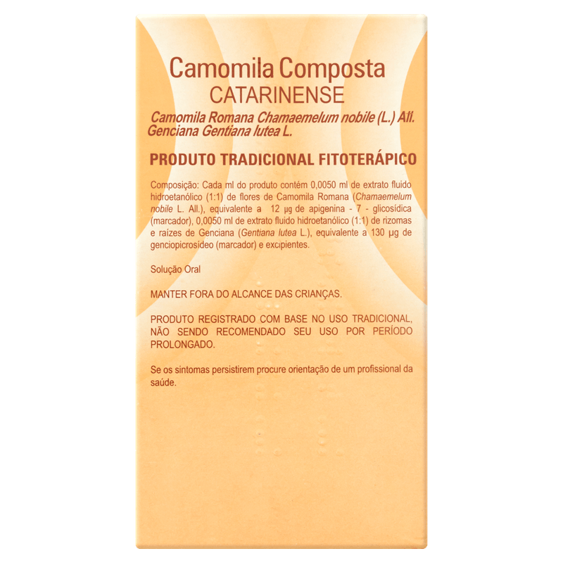 Cada ml da solução contém 0,0050 ml de extrato fluido hidroetanólico de flores de camomila romana, equivalente a 12 microgramas de apigenina-7-glicosídica, e 0,0050 ml de extrato fluido hidroetanólico de rizomas e raízes de genciana, equivalente a 130 microgramas de genciopicrosídeo. Apresentado em solução oral, com volume de 150 ml, o produto é livre de tarja e não requer prescrição médica. Indicado para adultos acima de 16 anos, a Camomila Composta Catarinense é uma opção confiável para quem busca um cuidado fitoterápico digestivo, respeitando sempre as orientações do folheto informativo.
