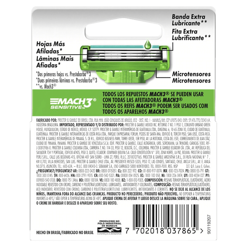 "Além das características da família Mach3 nas quais você já confia, a lâmina de barbear Mach3 Sensitive oferece uma fita lubrificante avançada* com a Tecnologia Skin Protect que protege contra irritação, mesmo em pele sensível. Para melhor performance, use em um aparelho Mach3 Sensitive.