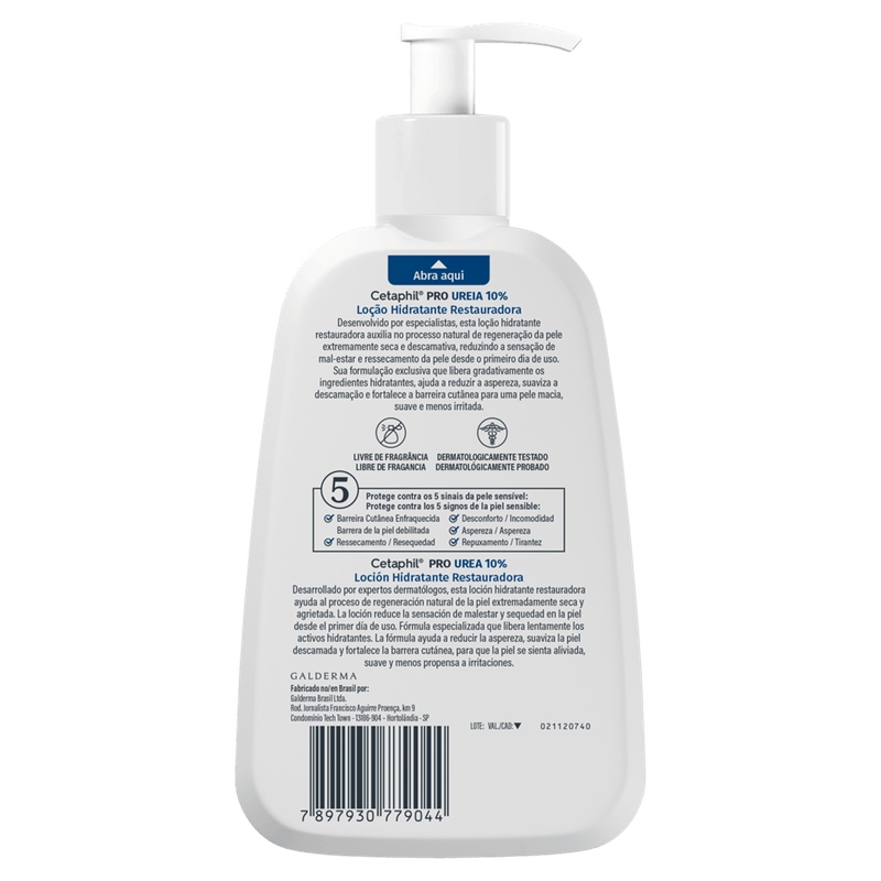 Cetaphil Pro Ureia 10% Loção Hidratante Restauradora auxilia no processo natural de regeneração da pele extremamente seca e descamativa, reduzindo a sensação de mal-estar e ressecamento da pele desde o primeiro dia de uso. Sua formulação exclusiva que libera gradativamente os ingredientes hidratantes, ajuda a reduzir a aspereza, suaviza a descamação e fortalece a barreira cutânea para uma pele macia, suave e menos irritada.