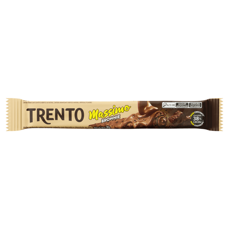 O Chocolate Trento Massimo Brownie 30g da Peccin é um doce do tipo wafer recheado, apresentado em embalagem flow pack. Sua principal finalidade é o consumo direto, oferecendo uma combinação de chocolate ao leite com 38% de cacau e recheio de brownie.