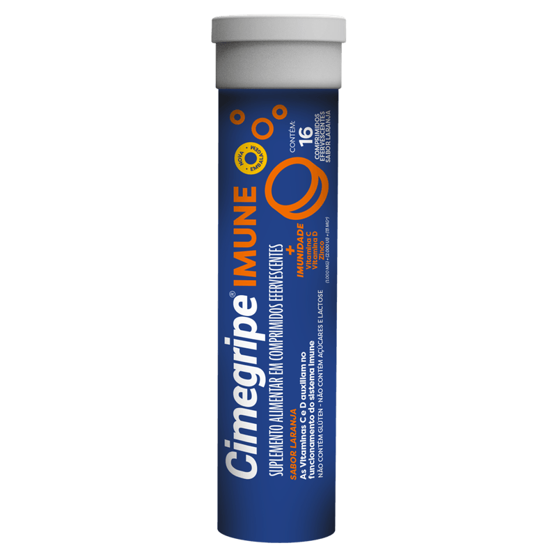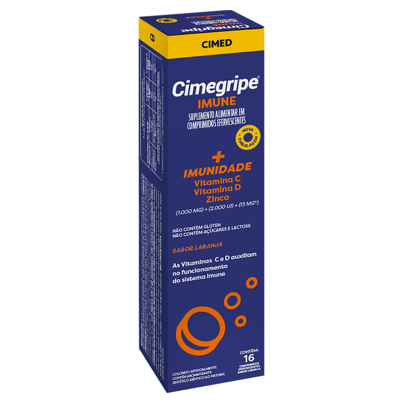 O Cimegripe Imune CIMED é um suplemento alimentar em comprimidos efervescentes que combina 1000 mg de vitamina C, 2000 UI de vitamina D e 13 mg de zinco para fortalecer o sistema imunológico e ajudar na prevenção de gripes e resfriados. Sua fórmula livre de açúcar, glúten e lactose é ideal para pessoas com restrições alimentares, oferecendo uma opção prática e saborosa de laranja para o cuidado diário da saúde.