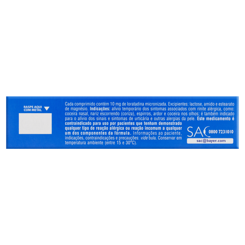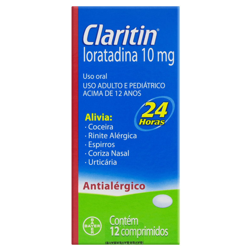 Cada embalagem contém 12 comprimidos de loratadina 10mg, com excipientes como lactose, amido de milho e estearato de magnésio. O produto é indicado para o alívio dos sintomas alérgicos, com ação prolongada e sem necessidade de receita médica para compra. Armazene em local seco e fresco, respeitando a validade de 24 meses após a fabricação. Claritin é a escolha segura e prática para quem busca qualidade e eficácia no controle das alergias do dia a dia.