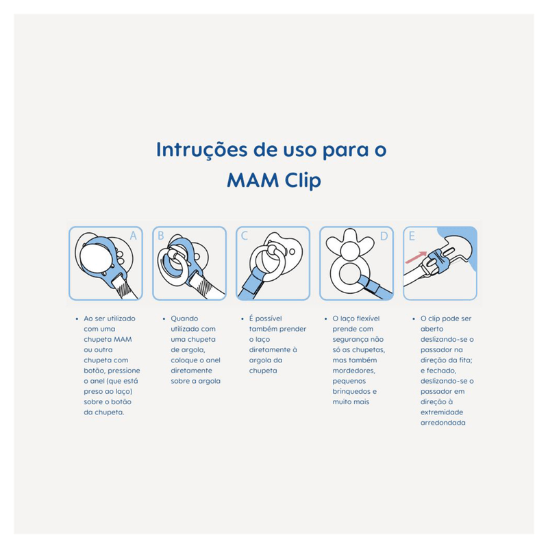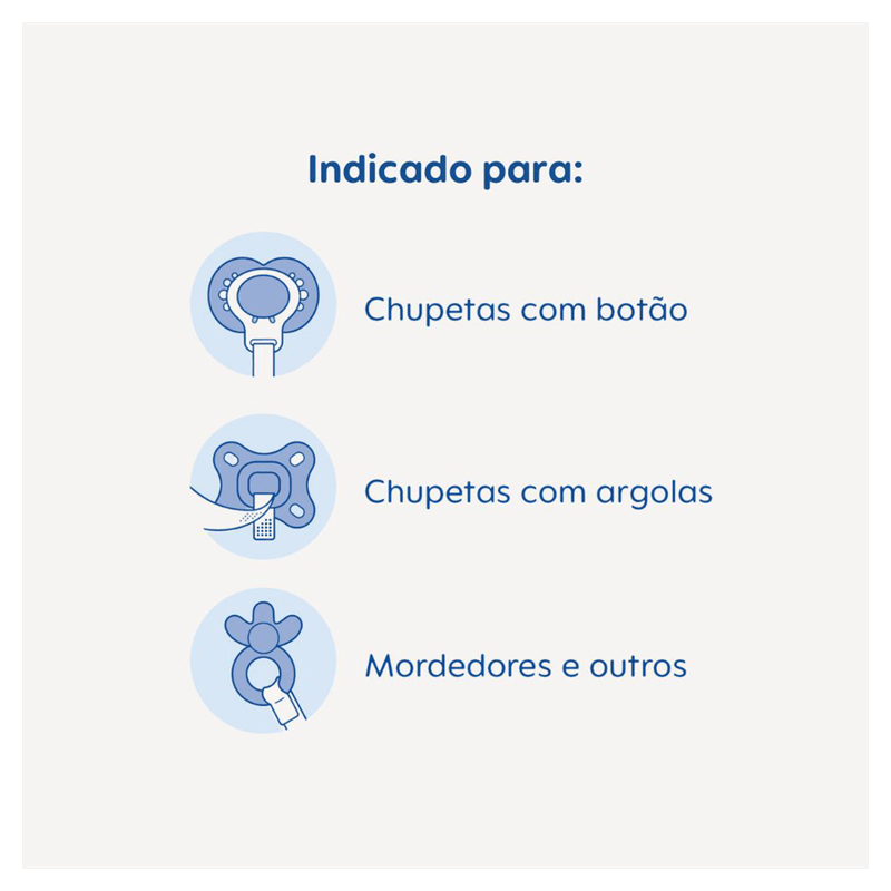 Prenda o anel flexível na chupeta ou mordedor, ajuste o comprimento da alça conforme necessário usando o regulador e fixe o clip na roupa do bebê para evitar quedas. Utilize sempre sob supervisão de um adulto. Após o uso, lave o prendedor com água e sabão neutro e guarde em local limpo e seco.