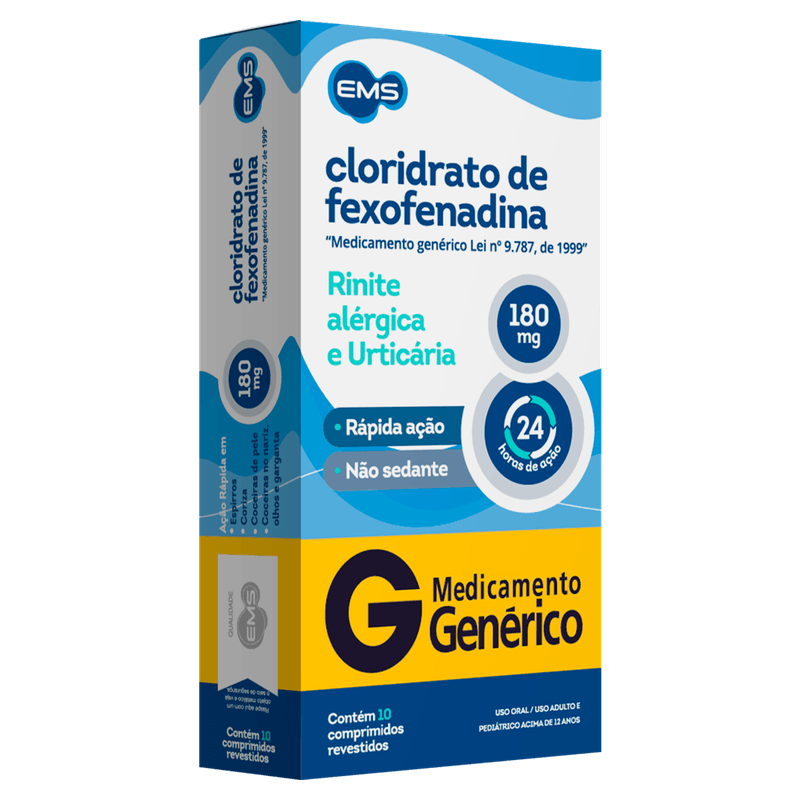 O Cloridrato de Fexofenadina 180mg Genérico EMS é um antialérgico eficaz indicado para o alívio dos sintomas de rinite alérgica, urticária, conjuntivite alérgica e febre do feno. Com ação rápida e duração de até 24 horas, este medicamento não causa sonolência, proporcionando conforto e qualidade de vida para adultos e crianças acima de 12 anos.