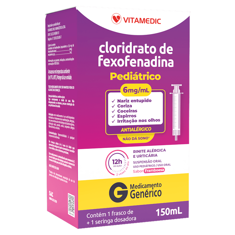 O Antialérgico Cloridrato de Fexofenadina 6mg Vitamedic Genérico é uma suspensão oral indicada para o alívio rápido e eficaz dos sintomas alérgicos, como rinite, urticária, conjuntivite alérgica, prurido, coriza e febre do feno. Seu princípio ativo bloqueia a ação da histamina, proporcionando alívio em cerca de 1 hora, com duração de até 12 horas, sem causar sonolência significativa. Ideal para adultos e crianças acima de 12 anos que buscam controle seguro e confortável dos sintomas alérgicos.
