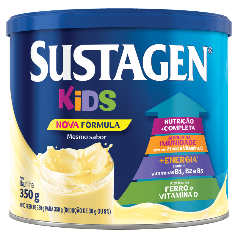 Uma alimentação saudável e balanceada é fundamental para o bom funcionamento do corpo e crescimento saudável. É por isso que Sustagen® Kids é o complemento alimentar que te ajuda a oferecer uma nutrição mais completa*. Sua nova fórmula oferece 27 vitaminas e minerais presentes em todos os grupos de alimentos da pirâmide alimentar, que ajudam a complementar a nutrição do seu filho. *Este produto não substitui a alimentação saudável e balanceada. Seu consumo deve estar associado a uma dieta equilibrada e hábitos de vida saudáveis. Consulte sempre um médico ou nutricionista. NÃO CONTÉM GLÚTEN.