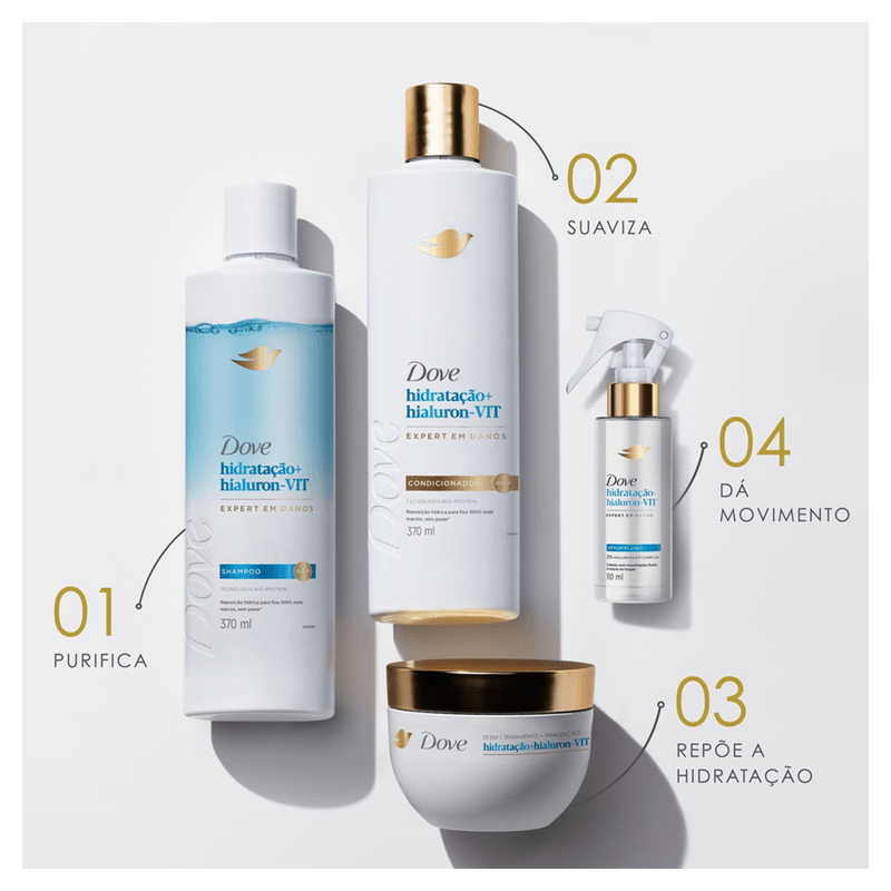 O Condicionador Dove Hidratação + Hialuron-VIT 370ml oferece hidratação intensa e duradoura para todos os tipos de cabelo. Enriquecido com ácido hialurônico e vitamina E, ele reduz o frizz, melhora a textura dos fios, nutre e fortalece, promovendo maciez e brilho excepcionais.