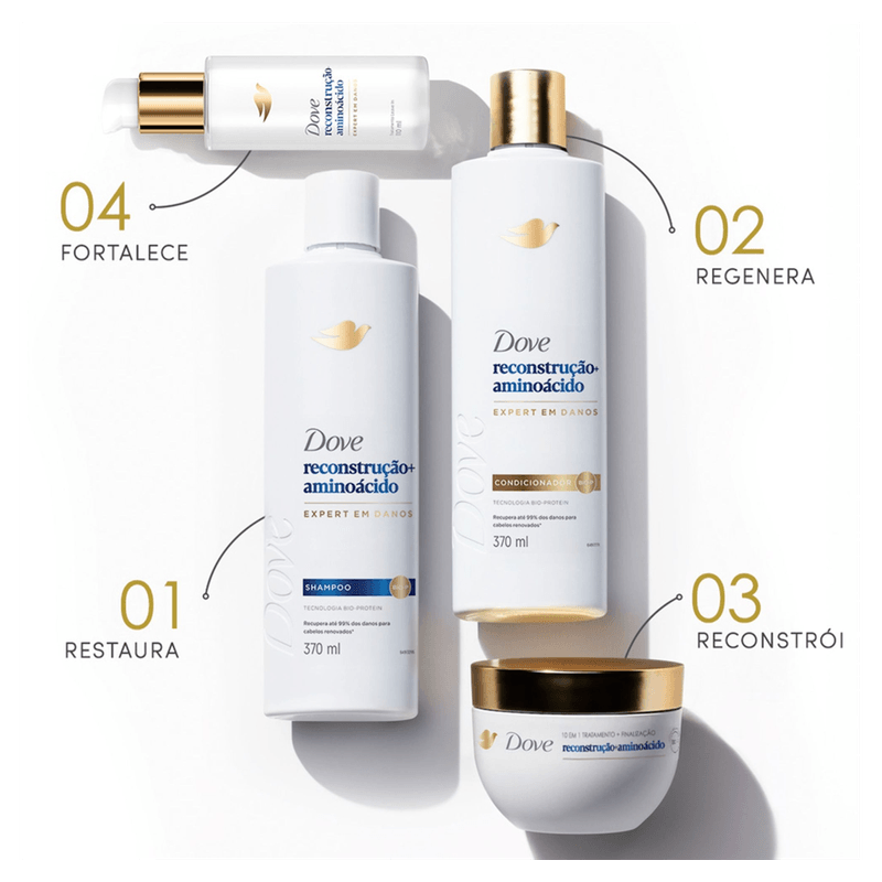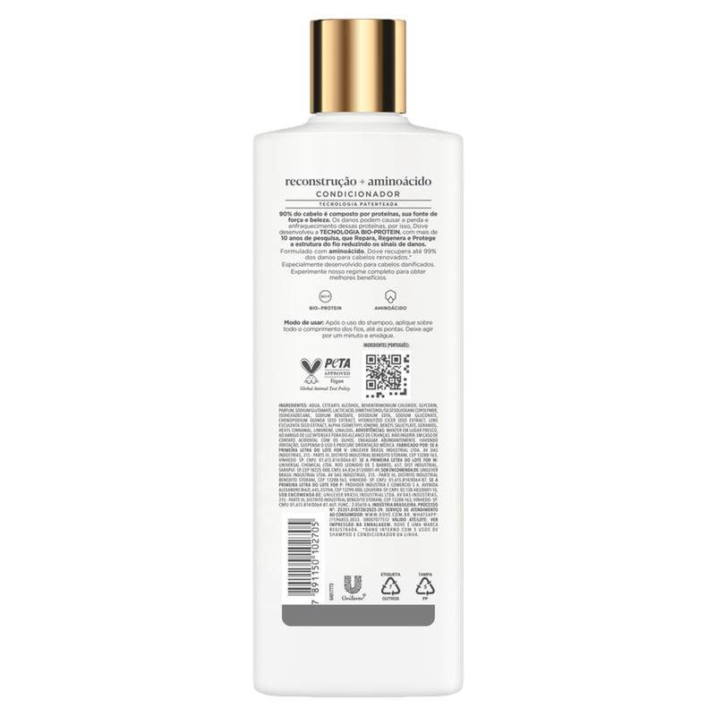 Modo de Usar: Utilize em conjunto com o shampoo da linha Dove Reconstrução + Aminocácido para melhores resultados. Aplique o condicionador nos cabelos limpos e úmidos, massageando suavemente. Enxágue completamente.