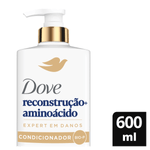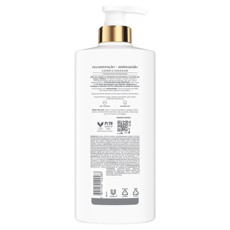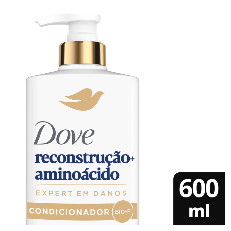 Modo de usar: Após lavar os cabelos com shampoo, aplique o condicionador Dove Reconstrução + Aminoácido no comprimento e pontas. Massageie suavemente e deixe agir por alguns minutos antes de enxaguar completamente.