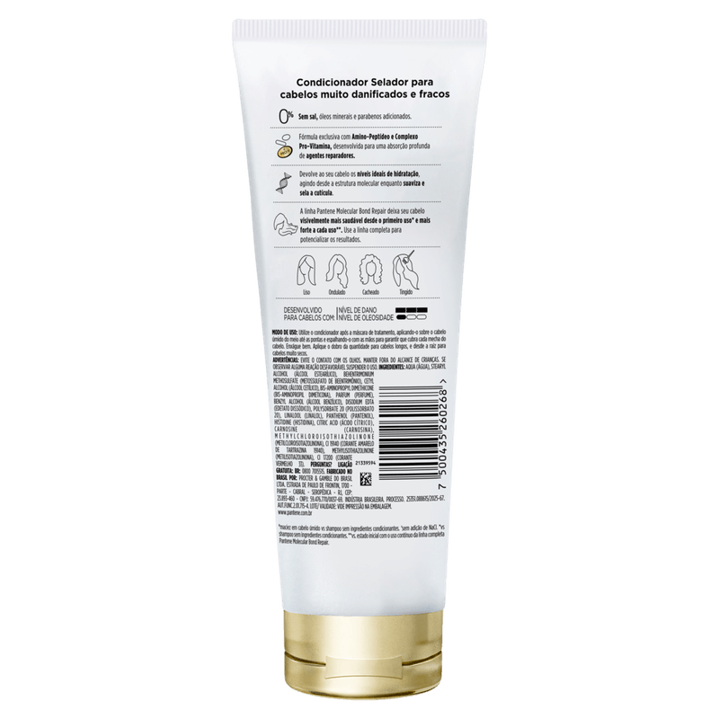 Composição: Água, álcool estearílico, metossulfato de beentrimônio, álcool cetílico, bis-aminopropil dimeticona, perfume, álcool benzílico, edetato dissódico, polissorbato 20, linalol, pantenol, histidina, ácido cítrico, carnosina, metilcloroisotiazolinona, corante amarelo de tartrazina 19140, metilisotiazolinona, corante vermelho 33.