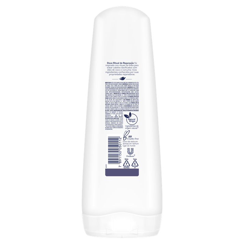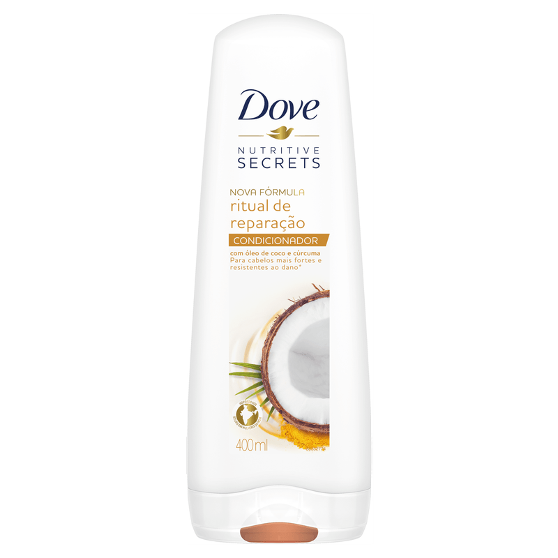 - O Condicionador Dove Ritual de Reparação possui a nova fórmula com óleo de coco e cúrcuma para deixar seus cabelos mais fortes e resistentes ao dano*