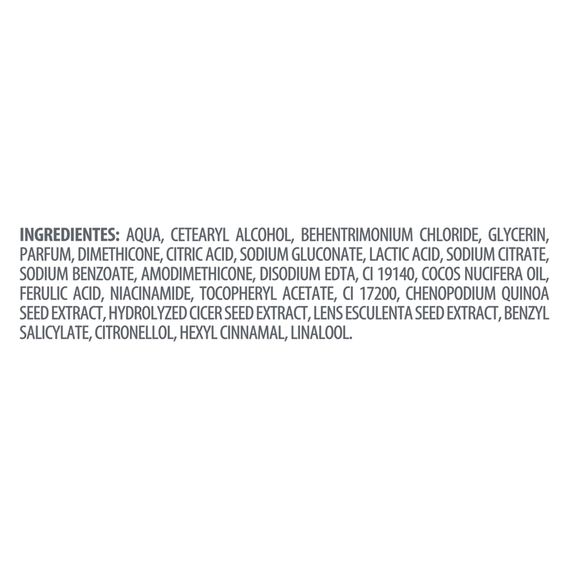 Aqua, cetearyl alcohol, behentrimonium chloride, glycerin, parfum, dimethicone, citric acid, sodium gluconate, lactic acid, sodium citrate, sodium benzoate, amodimethicone, disodium EDTA, CI 19140, cocos nucifera oil, ferulic acid, niacinamide, tocopheryl acetate, CI 17200, chenopodium quinoa seed extract, hydrolyzed cicer seed extract, lens esculenta seed extract, benzyl salicylate, citronellol, hexyl cinnamal, linalool.
