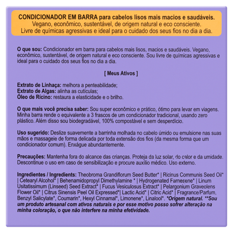 O que sou: condicionador em barra para cabelos mais nutridos e saudáveis. Vegano, econômico, sustentável, de origem natural e eco consciente. Sou livre de químicas agressivas e ideal para o cuidado dos seus fios no dia a dia.