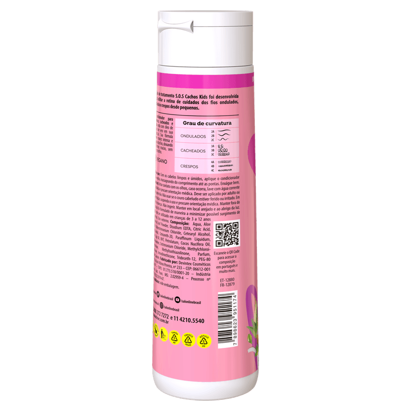 Após lavar os cabelos com shampoo, aplique o condicionador nos fios úmidos, massageando suavemente. Deixe agir por alguns minutos e enxágue completamente. Utilize sempre que necessário para manter os cachos hidratados e desembaraçados. Conserve o produto em local fresco e seco, longe da luz direta.