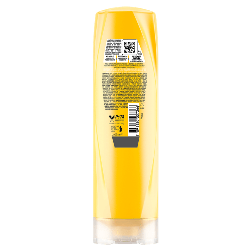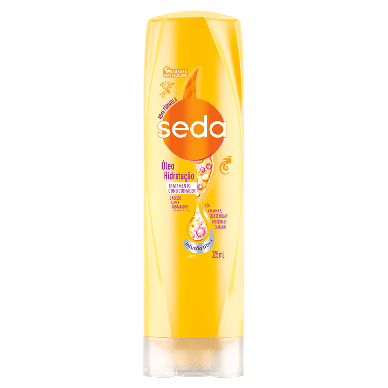 Modo de usar: Após o shampoo, aplique o condicionador nos cabelos molhados, espalhando por toda a extensão, com foco nas pontas. Deixe agir por 30 segundos e enxágue completamente. Para melhores resultados, utilize junto com o Shampoo Seda Óleo Hidratação.