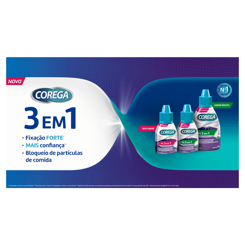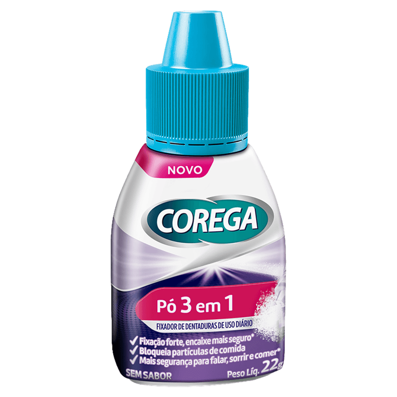 O Fixador de Dentadura Pó 3 em 1 22g Sem Sabor Corega é um produto em pó desenvolvido para fixação de próteses dentárias, proporcionando maior conforto e segurança durante o uso diário.