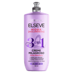 O Creme Milagroso Elseve 3 em 1 Hidra Hialurônico combina três funções em um único produto: creme para pentear, tratamento intensivo e supercondicionador. Sua fórmula enriquecida com ácido hialurônico oferece hidratação profunda sem pesar e vem em uma embalagem de 500ml.