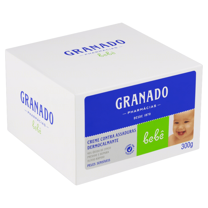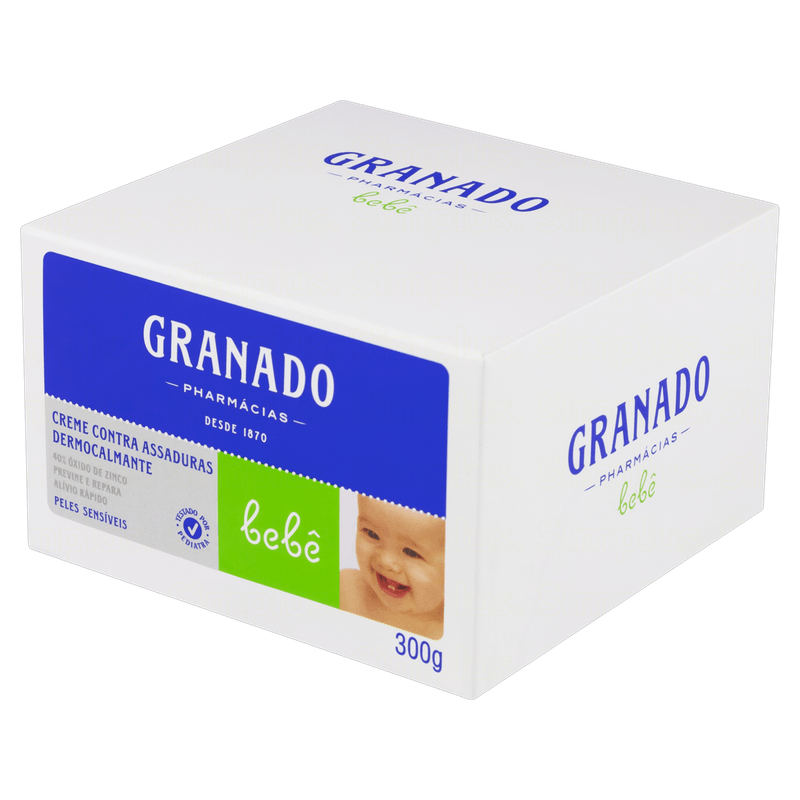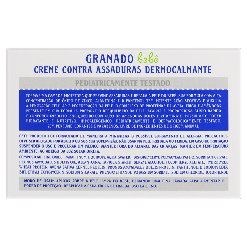 O Creme Contra Assaduras Dermocalmante da Granado é ideal para prevenir e reparar a pele sensível do bebê. Com uma fórmula enriquecida com 40% de óxido de zinco, proporciona alívio rápido e conforto imediato, formando uma barreira protetora contra a umidade. Contém D-pantenol, alantoína, óleo de amêndoa doce, proteínas do trigo e aveia, e vitamina E, tornando-o hipoalergênico e seguro para recém-nascidos. O produto é dermatologicamente e pediatricamente testado, livre de parabenos, corantes, perfumes e ingredientes de origem animal. Para uso, aplique sobre a pele limpa do bebê, formando uma fina camada, e reaplique a cada troca de fralda. Embalagem econômica com 300g.