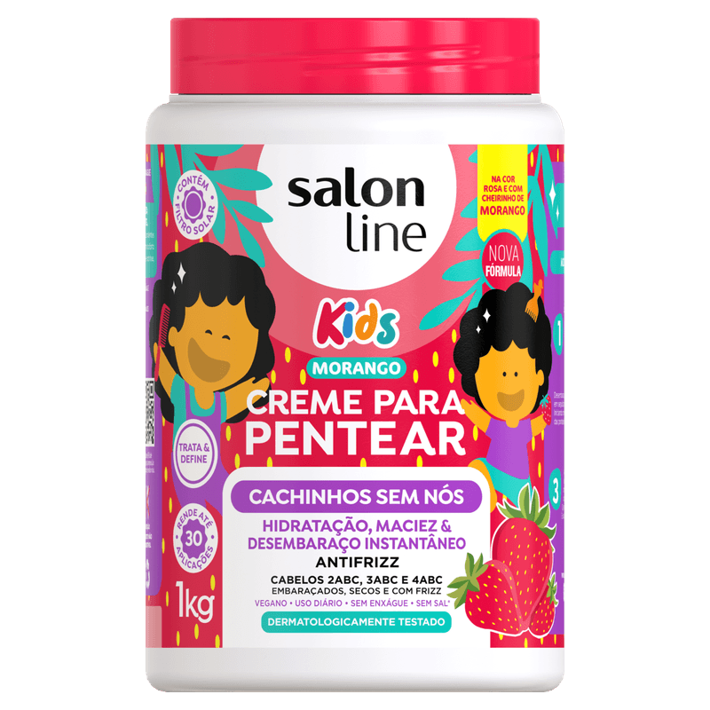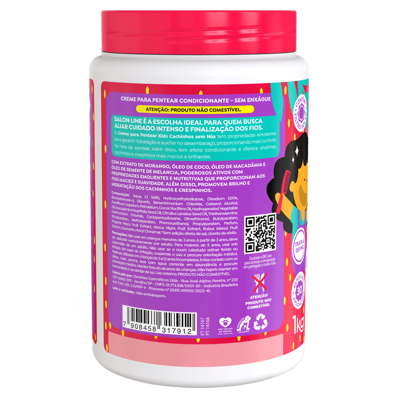 O Creme para Pentear Kids Cachinhos Sem Nós da Salon Line é ideal para cuidar dos cachinhos das crianças. Com fórmula dermatologicamente testada, proporciona hidratação intensa e emoliência, facilitando o desembaraço e garantindo conforto na hora de pentear. O efeito condicionante deixa os fios macios e brilhantes, sendo uma escolha confiável para a rotina capilar infantil. É vegano, não testado em animais e possui fragrância frutal, indicado para crianças a partir de 3 anos. Para melhores resultados, aplique com os cabelos molhados, dividindo em mechas. Evite sobrepor produtos coloridos e use proteção nas roupas durante a aplicação. O creme é livre de parabenos e não contém ingredientes nocivos, garantindo segurança e eficácia no uso.