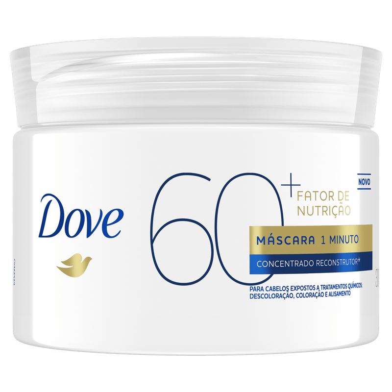A Máscara Dove Fator de Nutrição 60+ foi desenvolvida por experts com concentrado reconstrutor* para dar exatamente o cuidado e a hidratação profunda que o cabelo que foi quimicamente tratado precisa. Restaure seu cabelo com Creme de Tratamento Fator de Nutrição 60+, uma máscara reconstrutora feita especialmente para reparar danos causados por tratamentos químicos como descoloração, alisamento, permanente e tintura. Este creme de tratamento é indicado para cabelos descoloridos, alisados, tingidos ou com permanente, para ficarem suaves, sedosos e com aparência saudável. Esta máscara capilar possui em sua fórmula um potente mix de ingredientes ativos que reparam os danos causados pelo tratamento químico. Para usar basta, após lavar, aplicar generosamente em toda a extensão dos fios até às pontas, evitando as raízes. Deixar agir por 1 minuto e então enxaguar abundantemente para um cabelo sedoso e macio. Esta máscara capilar repara o cabelo em apenas um minuto. Perfeita para usar durante a sua rotina de cuidados semanal ou no cronograma capilar. Para melhores resultados, experimente toda a linha Dove Fator de Nutrição 60+. Todos os produtos Dove são livres de crueldade animal e certificados pela PETA. Globalmente, a Dove não faz testes em animais em nenhum lugar do mundo.