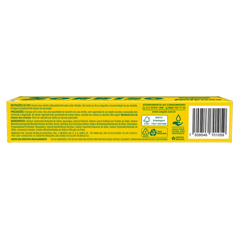 Composição Carbonato de cálcio, água, glicerol, lauril sulfato de sódio, monofluorfosfato de sódio (1450 ppm de flúor), aroma, carmelose sódica, bicarbonato de sódio, pirofosfato tetrassódico, álcool benzílico, sacarina de sódio, hidróxido de sódio, limoneno.