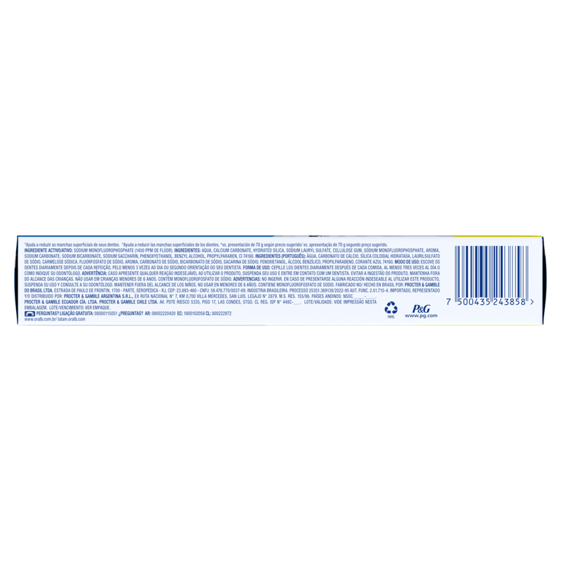 Escove as superfícies externas e internas dos dentes, além da língua, utilizando o Creme Dental Oral-B Extra Branco 180g. Recomenda-se escovar os dentes três vezes ao dia ou conforme orientação do dentista. Conserve o produto em local seco e fresco, longe da umidade.