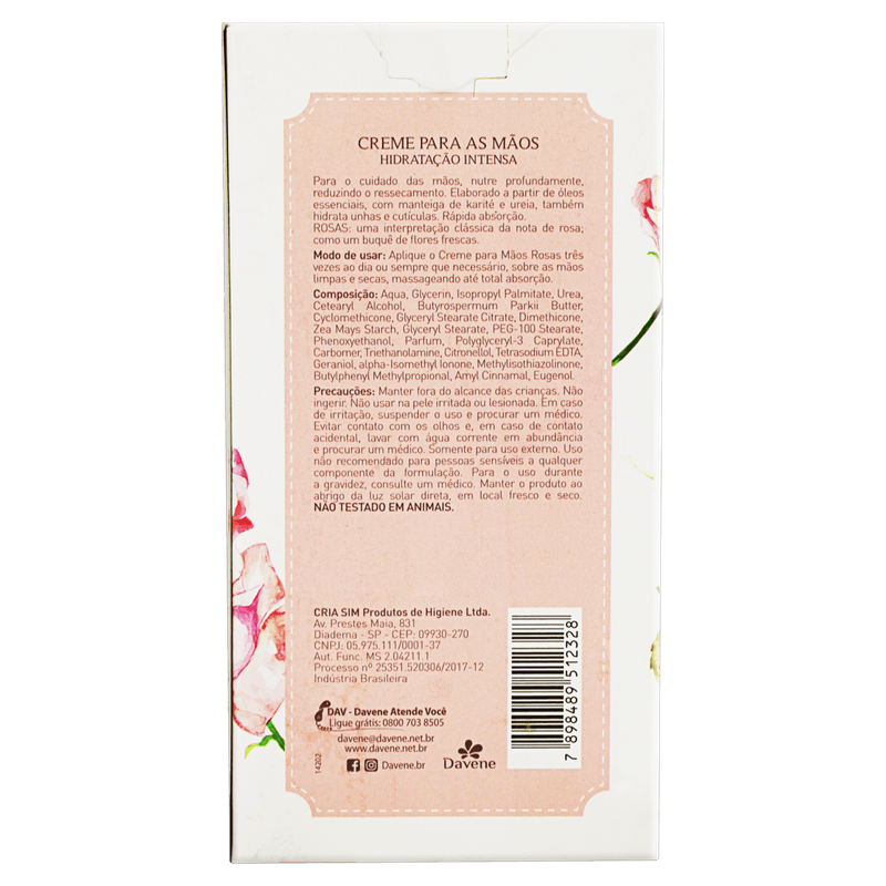 O Creme para Mãos Hidratação Intensa Rosas Davene é ideal para quem busca uma hidratação profunda e duradoura para as mãos e unhas. Com fragrância delicada de rosas, sua fórmula rica em ingredientes nutritivos promove maciez, suavidade e proteção contra o ressecamento, deixando a pele confortável e perfumada.