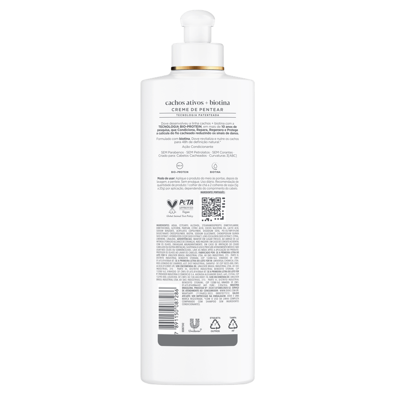Dove Texturas Reais foi criada para as necessidades específicas de cabelos ondulados, cacheados e crespos, com ingredientes ativos concentrados que nutrem profundamente os fios, mantendo-os saudáveis e potencializando suas texturas reais. O Creme para Pentear Dove Texturas Reais Cacheados proporciona nutrição, definição intensa e controle de frizz para os cabelos cacheados. Desenvolvido com ingredientes hidromodeladores concentrados, como o óleo de babosa, este creme de pentear nutre e amacia profundamente o cabelo para cachos bem definidos. Esse creme para cabelos é feito com ingredientes de origem natural* e não possui na sua fórmula parabenos, petrolatos e corantes, para nutrir e definir profundamente os fios de cabelo. Dove Texturas Reais Cacheados foi criado para cabelos cacheados com Curvatura 3 [ABC], deixando seus cachos lindos e saudáveis. Para deixar seus cachos bem nutridos e definidos, aplique o produto do meio às pontas depois da lavagem e penteie. Sem enxágue. Produto para uso diário. Use toda a linha Dove Texturas Reais Cacheados para potencializar a textura dos seus cabelos – Shampoo Dove Texturas Reais Cacheados e Condicionador Texturas Reais Cacheados. Todos os produtos Dove são livres de crueldade animal e certificados pela PETA. Globalmente, a Dove não faz testes em animais em nenhum lugar do mundo. Nossa missão é garantir que a próxima geração cresça desfrutando de um relacionamento positivo com sua própria aparência, ajudando jovens a aumentarem sua autoestima e desenvolverem todo seu potencial. A diferença de Dove feita com cuidado. *96% de ingredientes de origem natural, incluindo a água.
