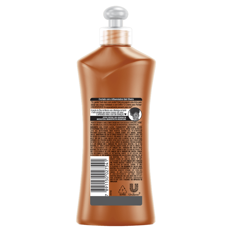 Pensando nisso, o Creme de Pentear Seda Crespoforce By Gabi Oliveira 300ml foi criado com uma fórmula exclusiva de Óleo de Marula e Manteiga de Karité, conhecidas pelas propriedades de nutrição e revitalização. O óleo de Marula, proveniente da fruta típica africana, rico em minerais e vitaminas, é conhecido pela rápida absorção e auxiliar na hidratação e nutrição do fio da raiz às pontas. A Manteiga de Karité¸ conhecida por fornecer extraordinárias propriedades hidratantes, é muito utilizada pra suavizar e revitalizar os cabelos.
