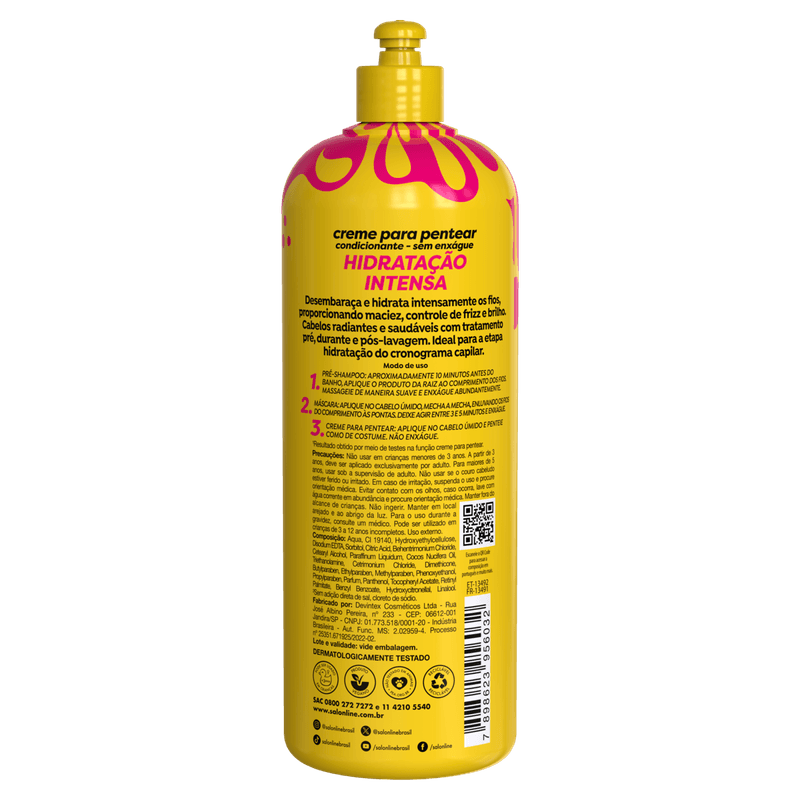 Modo de usar: Aplique o creme para pentear nos cabelos limpos e úmidos, distribuindo uniformemente do comprimento às pontas. Penteie para desembaraçar e finalize como desejar. Não enxágue.