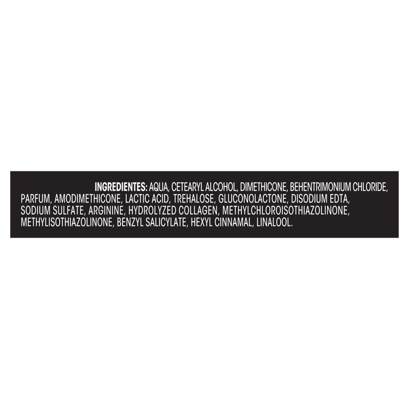 Composição: Aqua, cetearyl alcohol, dimethicone, behentrimonium chloride, parfum, amodimethicone, lactic acid, trehalose, gluconolactone, disodium EDTA, sodium sulfate, arginine, hydrolyzed collagen, methylchloroisothiazolinone, methylisothiazolinone, benzyl salicylate, hexyl cinnamal, linalool.