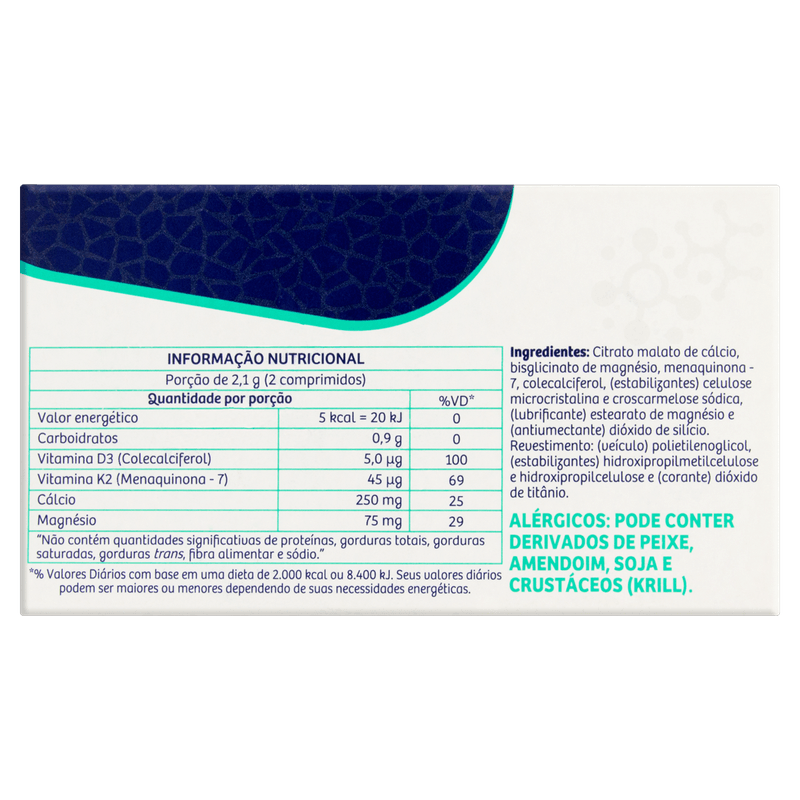 Cada porção contém 250 mg de cálcio (citrato malato de cálcio), 75 mg de magnésio (bisglicinato de magnésio), 5 µg de vitamina D3 (colecalciferol) e 45 µg de vitamina K2 (menaquinona-7). Apresentado em comprimidos revestidos, sem sabor, é indicado para uso oral e destinado a auxiliar na manutenção da saúde óssea, promovendo o metabolismo mineral adequado. Produto de venda livre, deve ser armazenado em local seco e fresco.