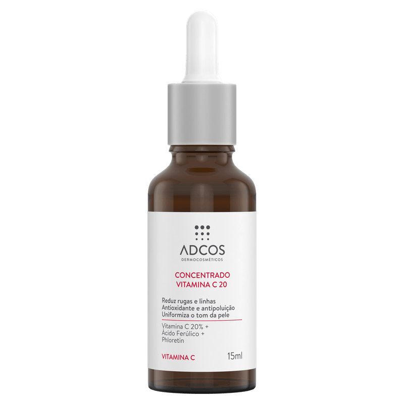 O Derma Complex Concentrado Vitamina C 20 da Adcos é um sérum anti-idade indicado para todos os tipos de pele que desejam uniformizar o tom, reduzir rugas e melhorar a firmeza. Com 20% de vitamina C em três formas, ele estimula a produção de colágeno e protege a pele contra os danos causados pela poluição e radiação UV, promovendo luminosidade e ação antioxidante eficaz.