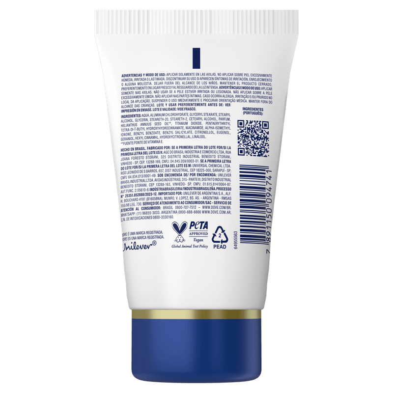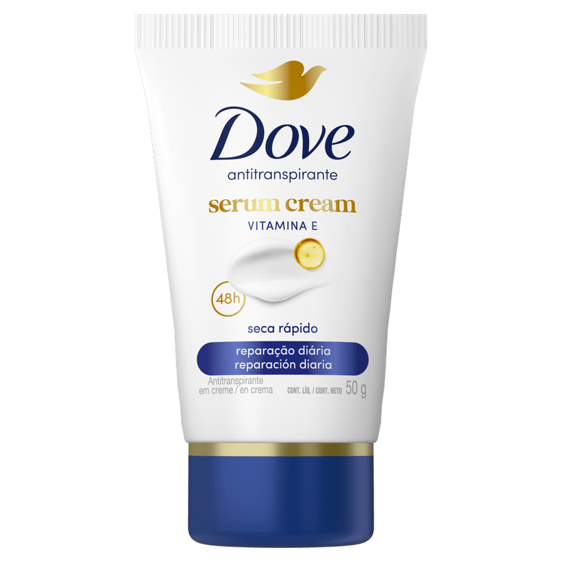 Desodorante Dove Creme Sérum Reparação Diária 50g, proporciona até 48 horas de proteção contra suor e odor, com a fragrância suave e tradicional de Dove Original. Enriquecido com ¼ de creme hidratante e vitamina E, ajuda a acalmar a pele após a depilação e é ideal para o cuidado da pele delicada das axilas.
