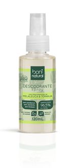O Desodorante Spray Melaleuca 120ml da Boni Natural é um desodorante spray vegano e natural, formulado com óleo essencial de melaleuca, aloe vera, toranja, calêndula e hamamélis. Indicado para proteção contra odores, oferece ação antibacteriana, antifúngica, anti-inflamatória e hidratação, proporcionando frescor e proteção por até 24 horas.